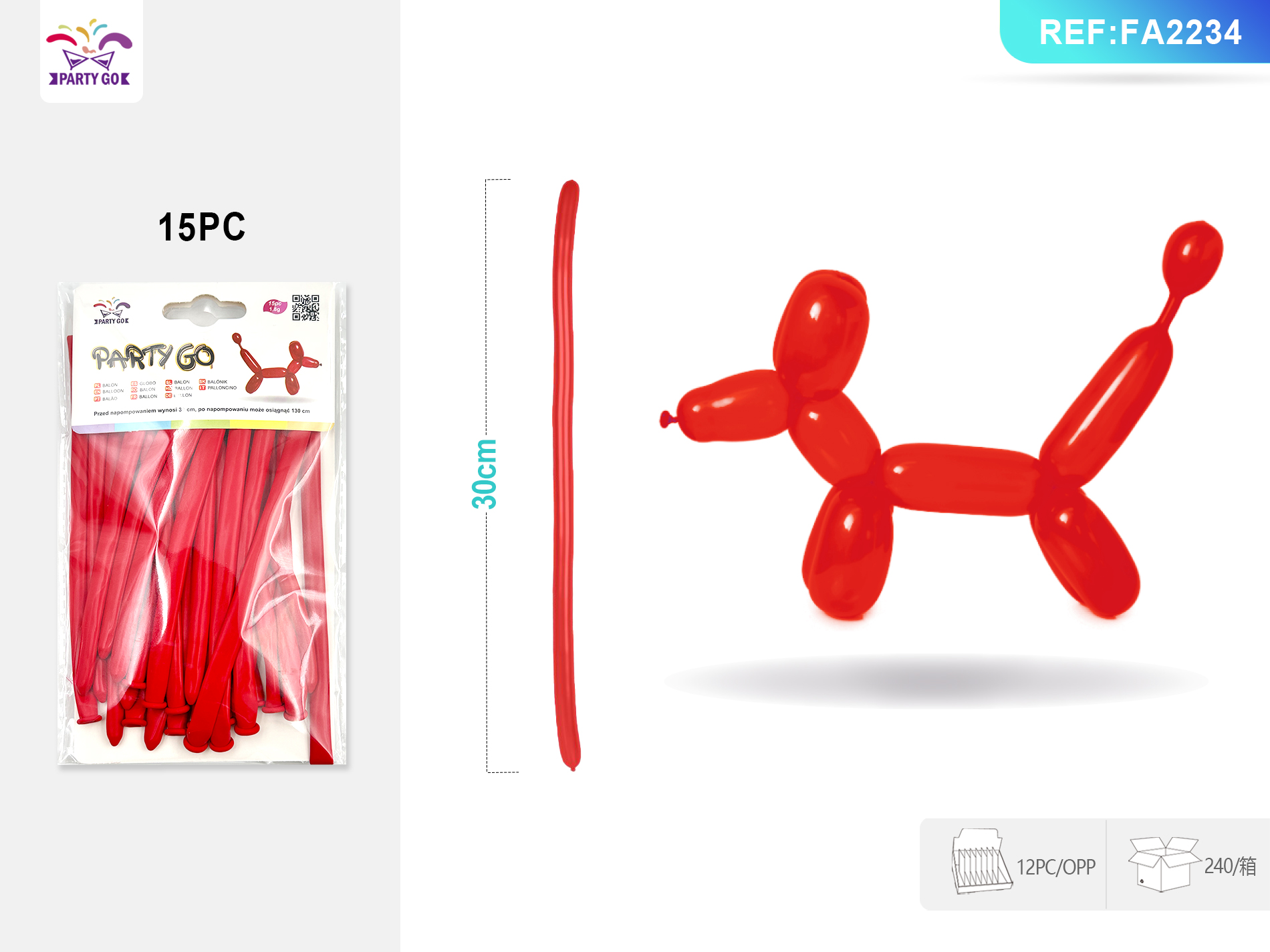 04-G1-1.8G 30CM 15szt. Jasnoczerwony matowy długi balon lateksowy