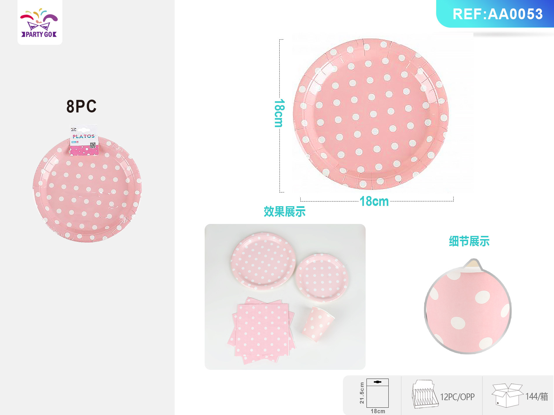 7-inch pink polka dot paper plate 18CM 8pcs