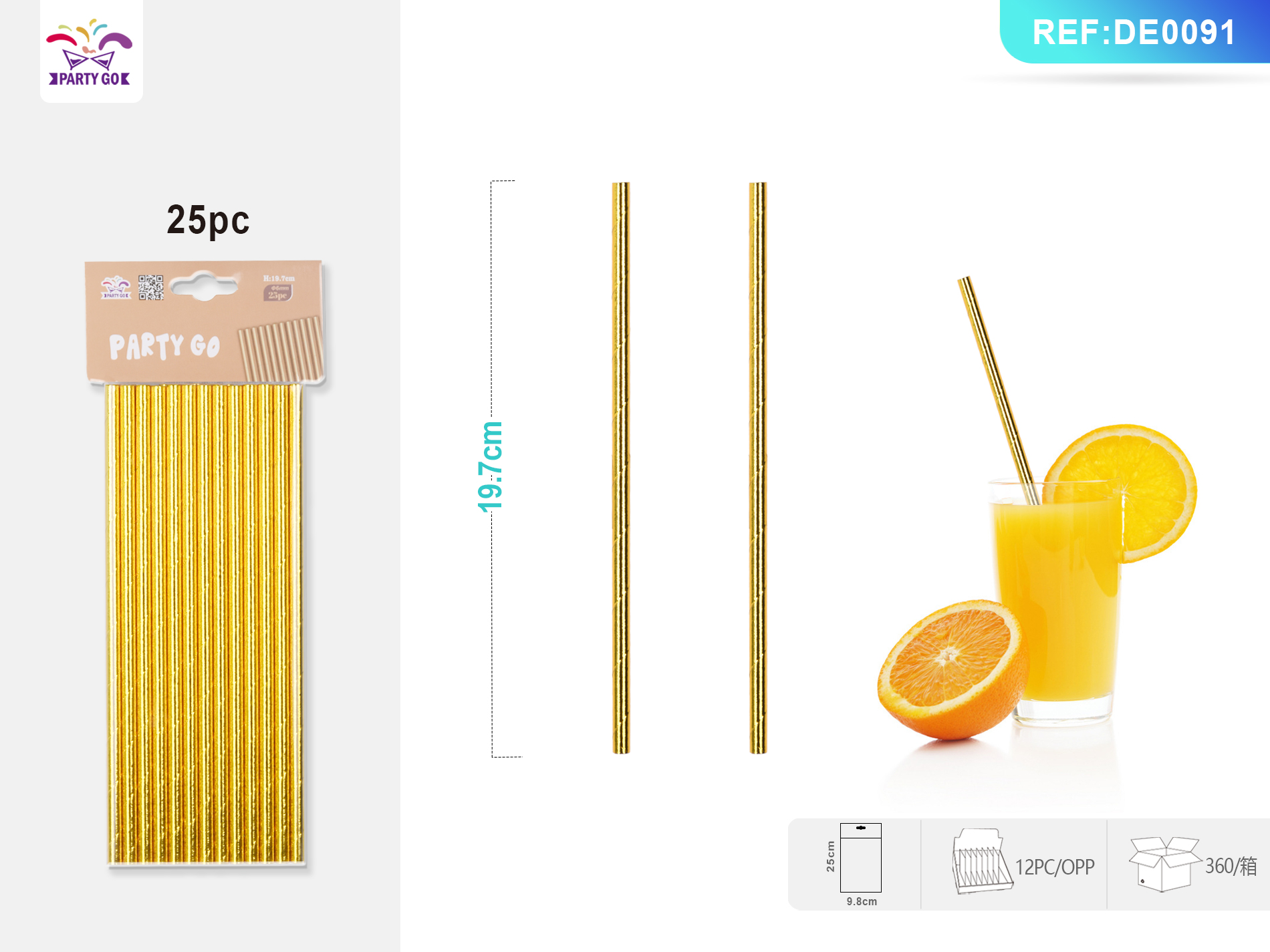 07-N2-Aluminum Foil Pure Gold Straw, 19.7cm, 25pcs