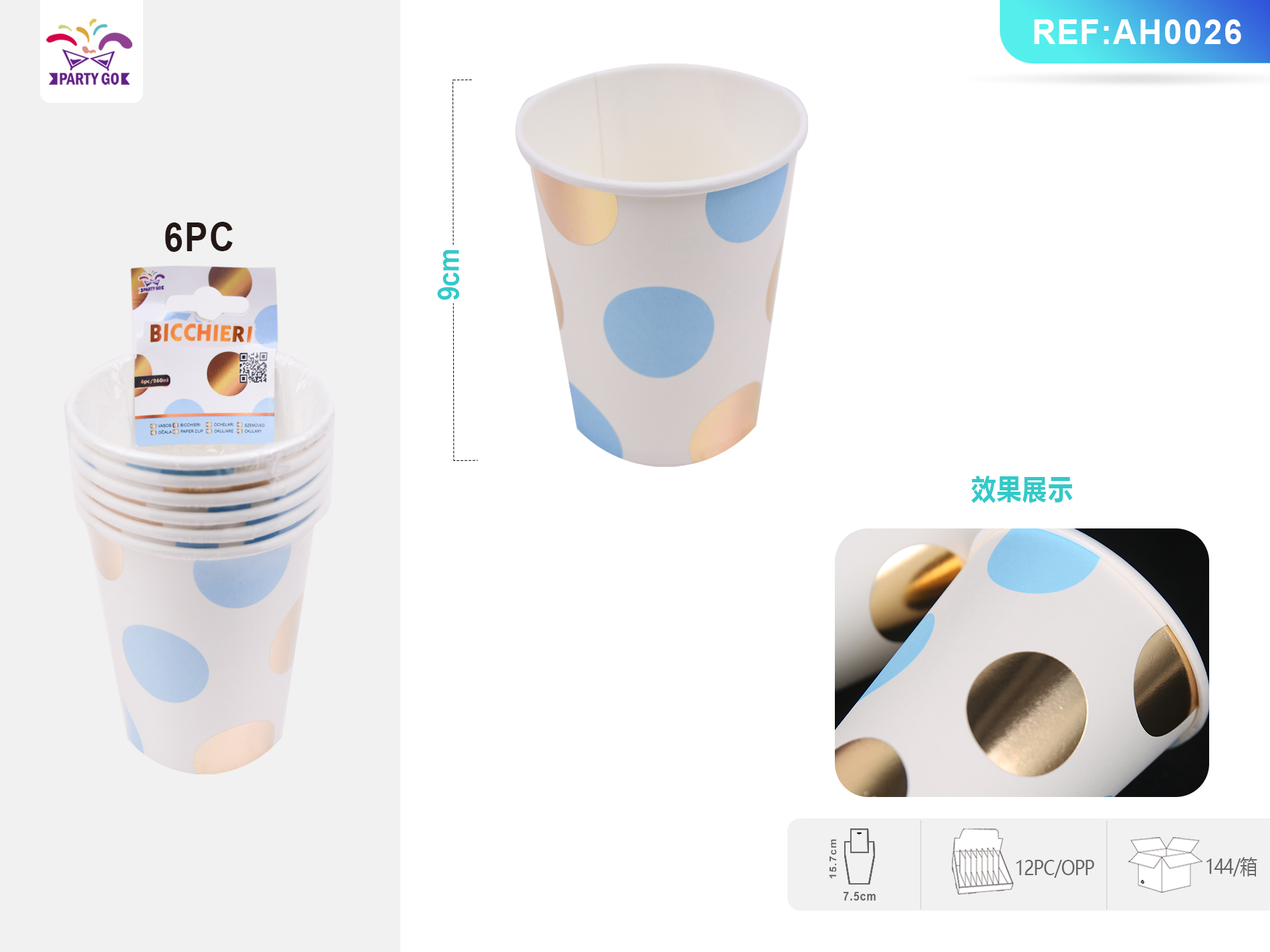Gold-stamped blue polka dot paper cup, 9.5CM, 6pcs-N