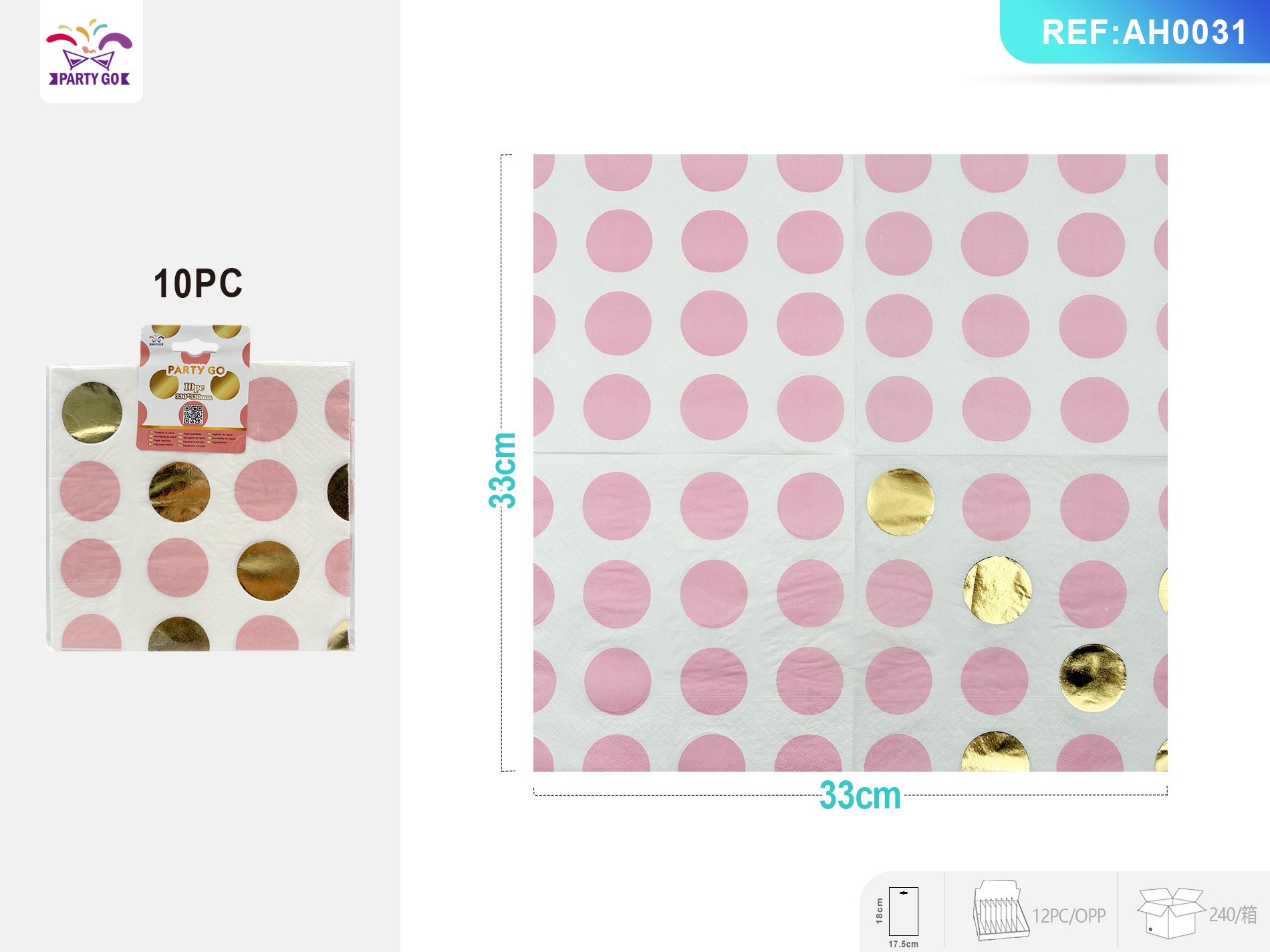 Gold-stamped pink polka dot tissues, 33*33CM, 10pcs-N