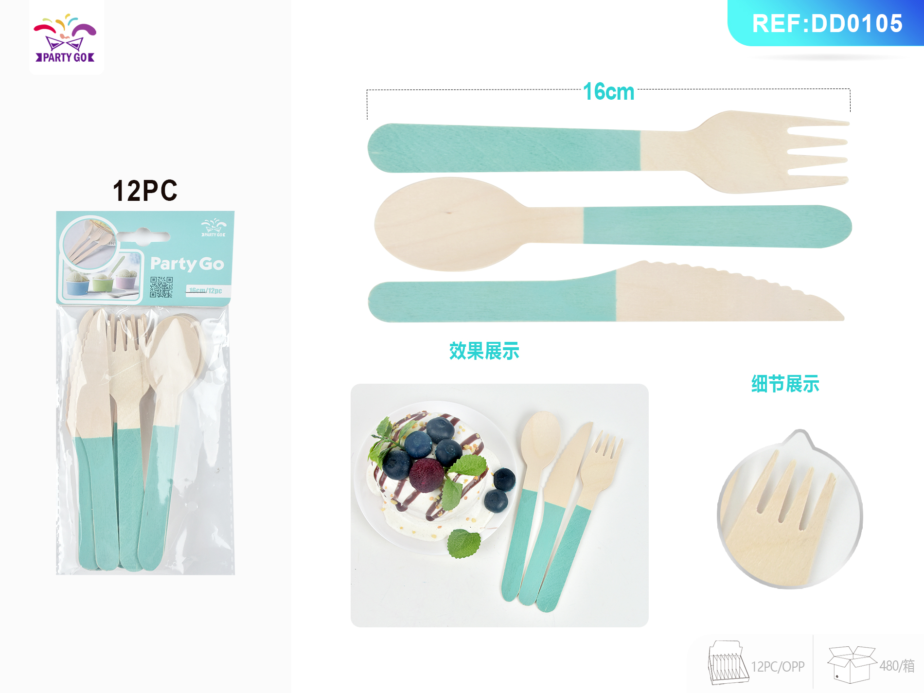 06-O2-Tiffany Blue Mieszane sztućce z drewna brzozowego Łyżka 16cm