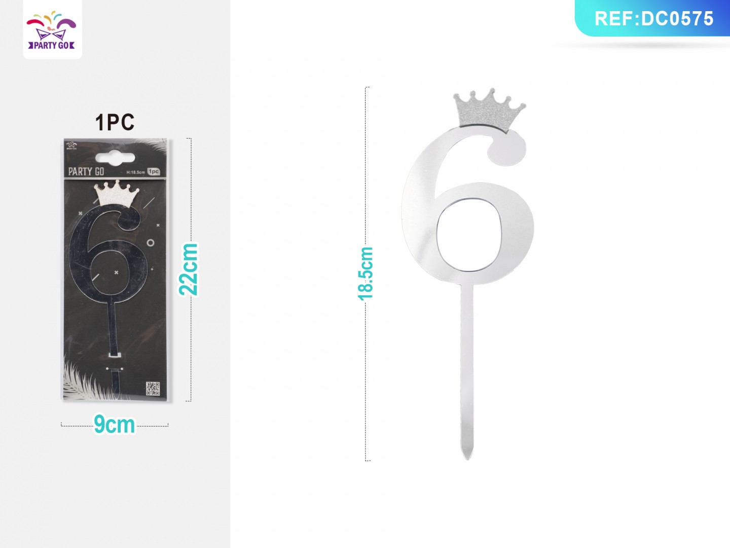 02-F4-Silver Powder Acrylic Crown Number 6 Cake Flag, 18.5CM, 1pc