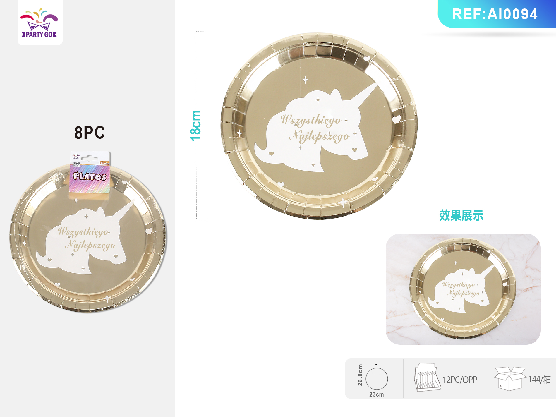 Laser-cut gold unicorn Polish 7-inch birthday paper plate, 18CM, 8pcs-N
