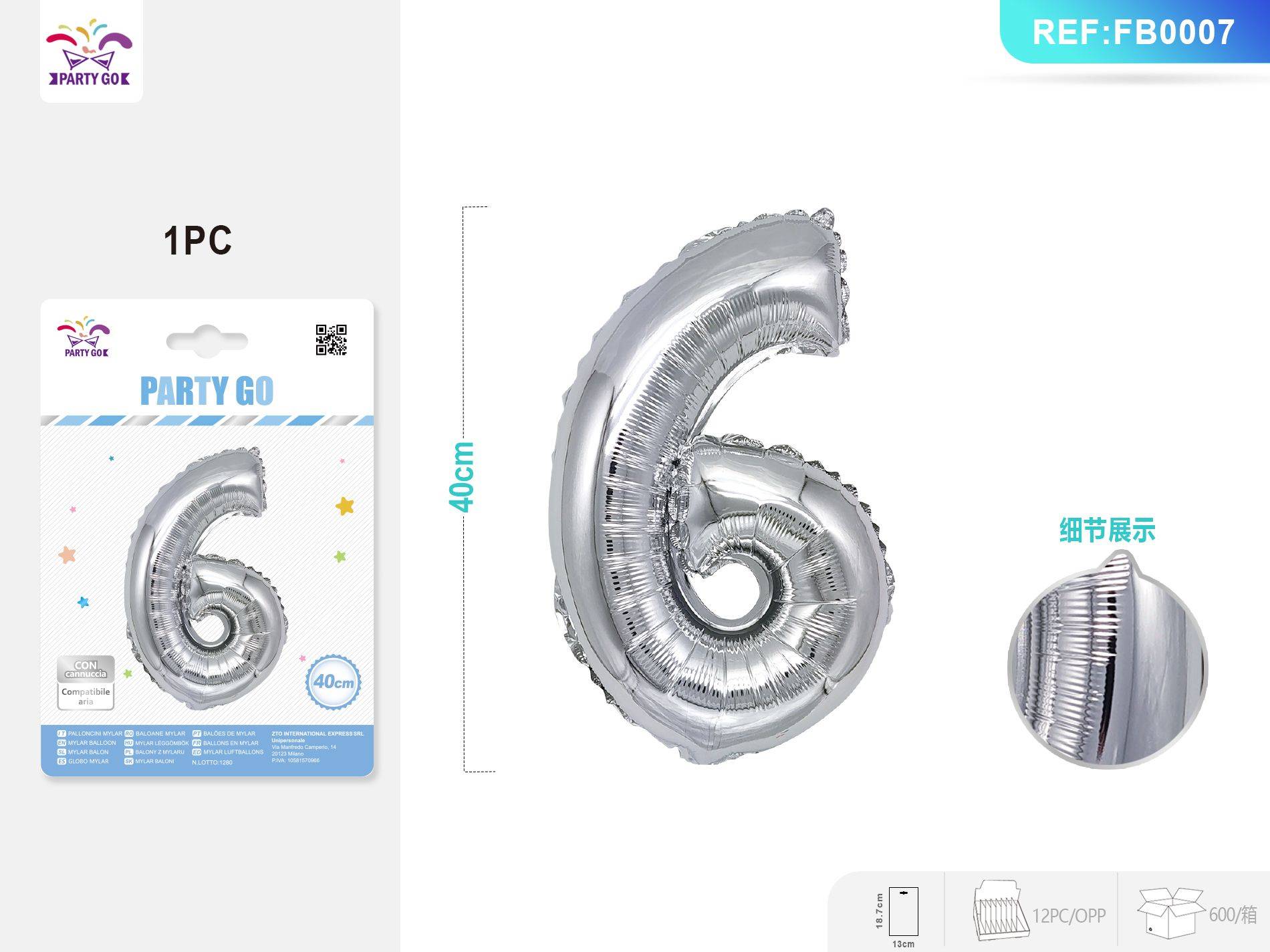 01-B3-Number 6 40CM Silver Aluminum Foil Balloon