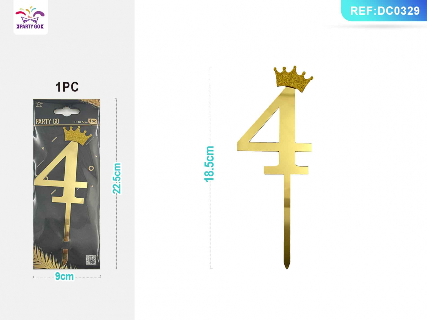 02-F3-Gold Powder Acrylic Crown Number 4 Cake Flag, 18.5CM, 1pc