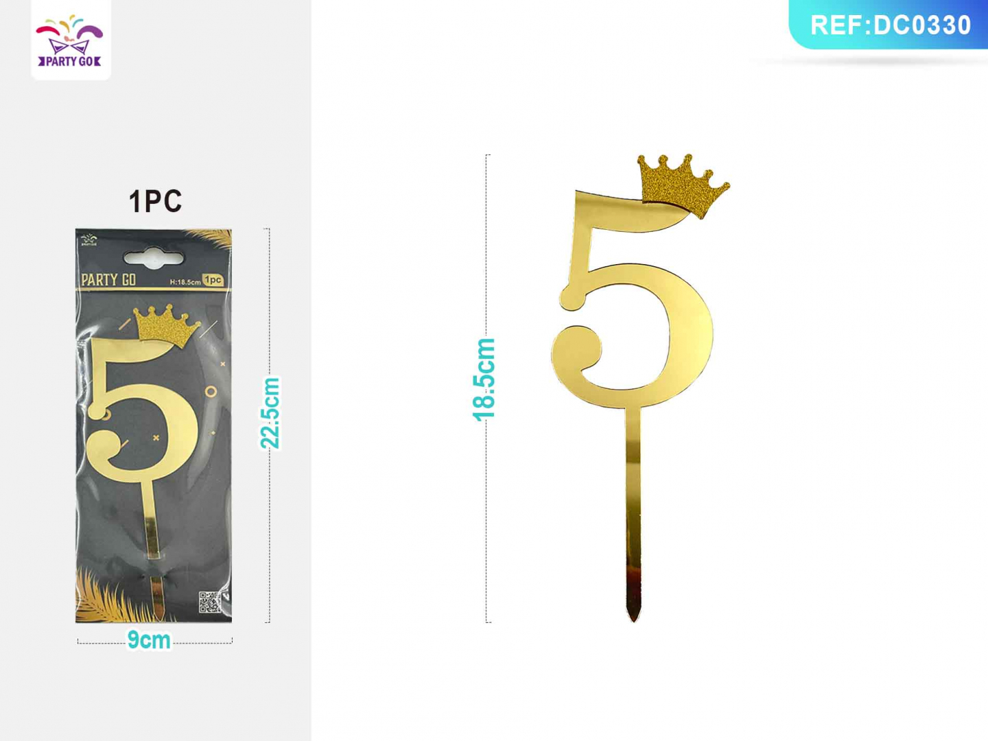 02-F3-Gold Powder Acrylic Crown Number 5 Cake Flag, 18.5CM, 1pc