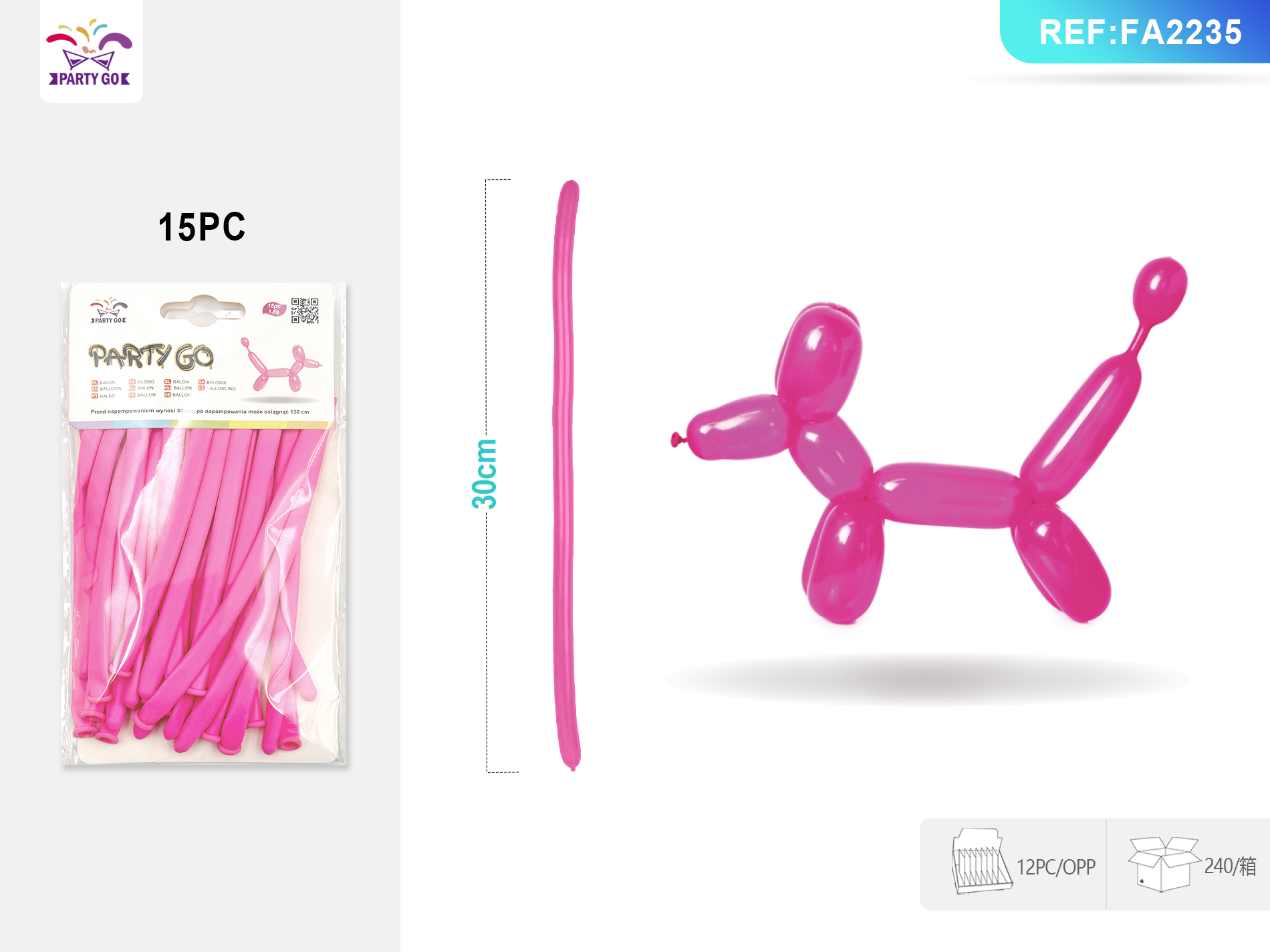 04-G1-1.8G 30CM 15 SZT. Różowy matowy balon lateksowy z długim paskiem