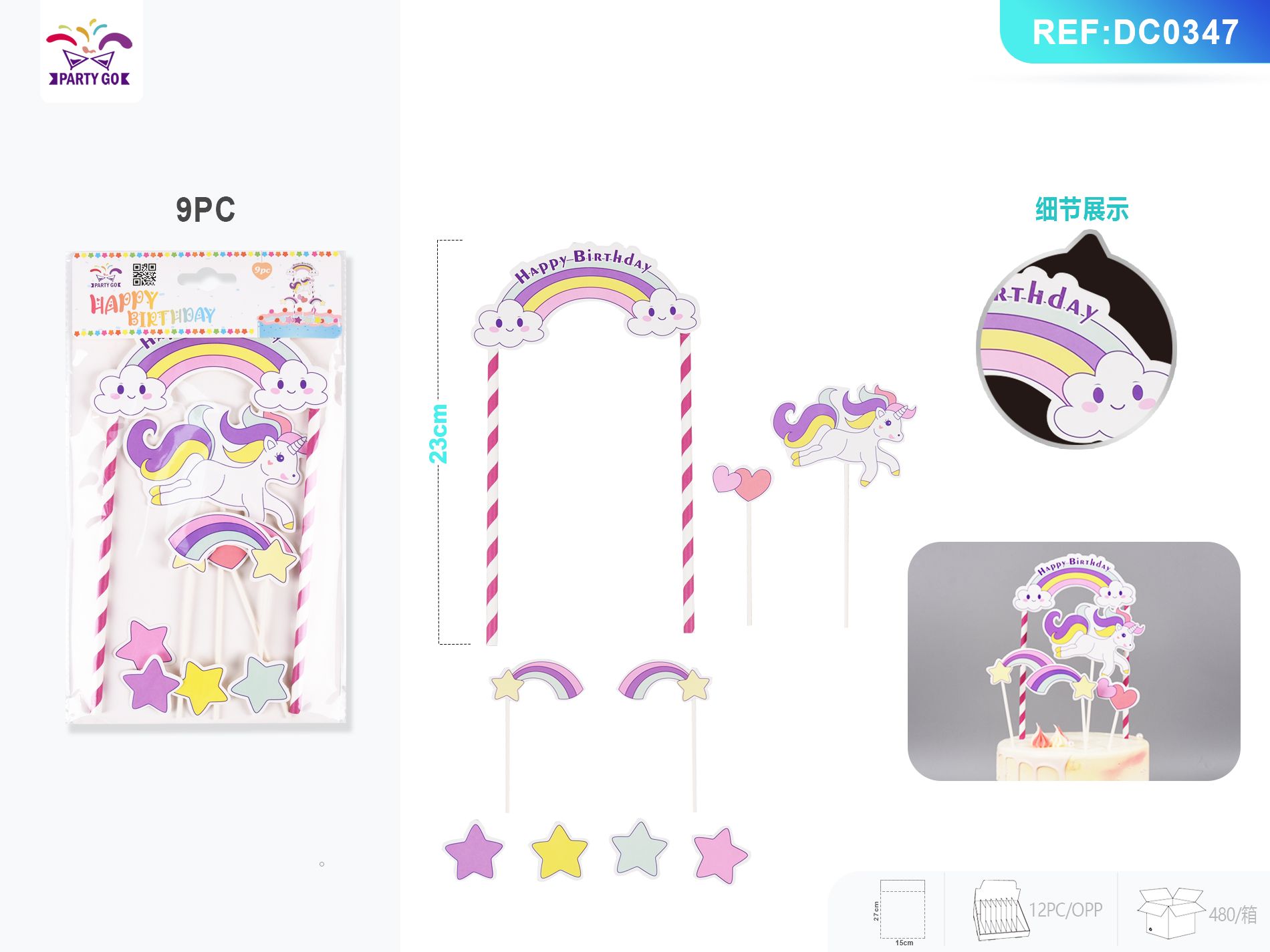 05-K3-Papierowy sztyft z jednorożcem Happy Birthday Cake Flag 23CM 9PC-N